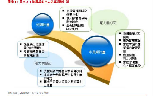 日本在 311 地震后對(duì)能源危機(jī)更加重視,節(jié)能成為其政策發(fā)展中的一大重點(diǎn),日本政府認(rèn)為,解決能源問題必須從供給(發(fā)電)和需求(使用)兩方面下手,在供給方面將著重發(fā)展再生能源發(fā)電,需求方面則促進(jìn)LED 照明等節(jié)能家電的普及。